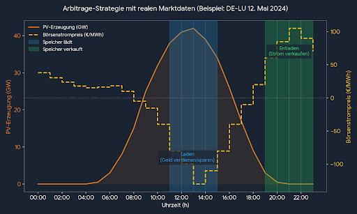 Veranschaulichung: Speicherung während der solaren Erzeugungsspitze (negative Preise) und Einspeisung in den lukrativen Abendstunden.